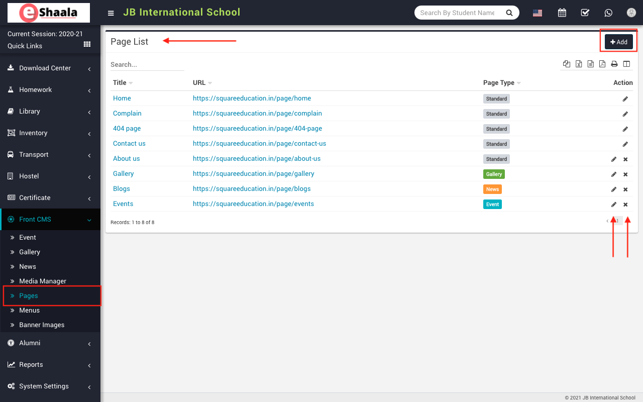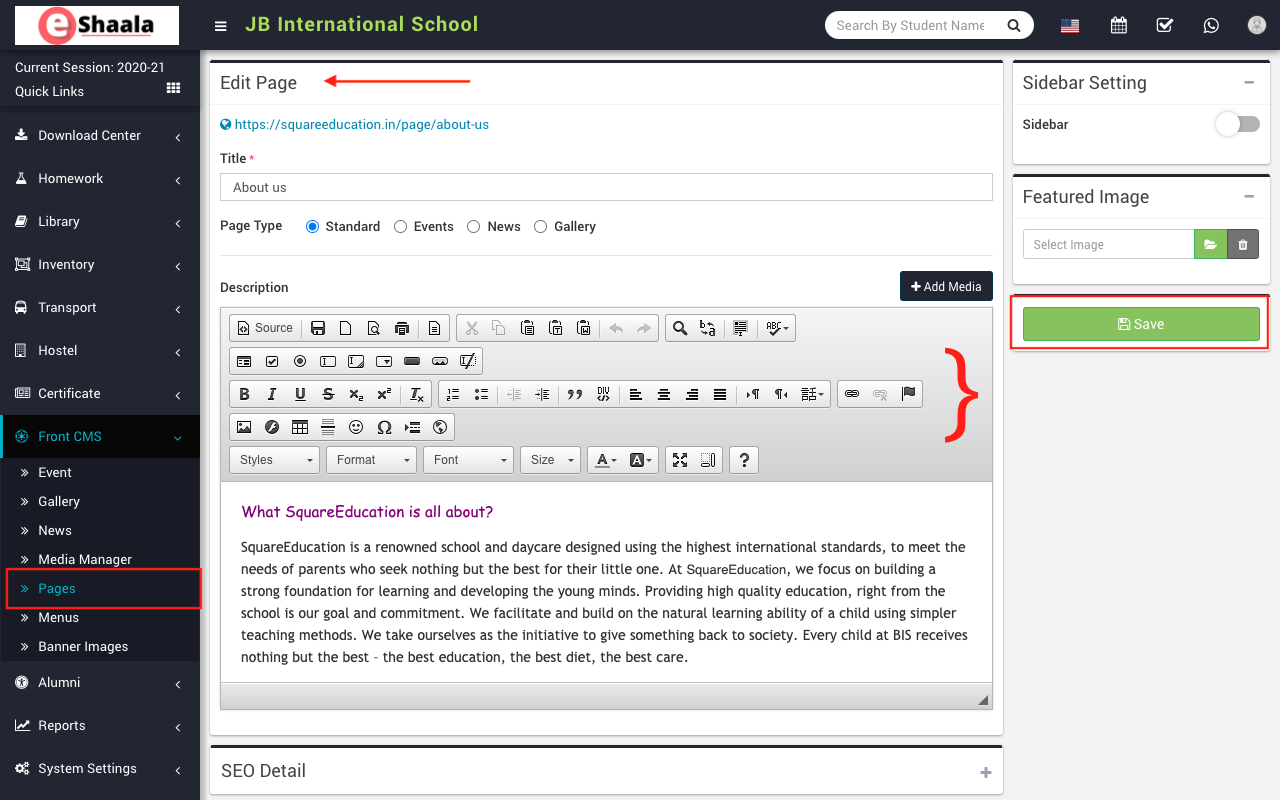 To add pages, go to Front CMS > Pages then click on Add button present at the top right corner in the page list page, then enter the page Title, select Page Type (Standard, Events (page to show all Events), News (page to show all News/Notices) and Gallery (page to show all images/video Galleries)) and Description, Add Media, SEO Detail click on Add (+) icon enter details here Meta Title, Meta Keyword, Meta Description and then select Sidebar Setting to show and hide the sidebar and select Featured Image and then click on Save button.