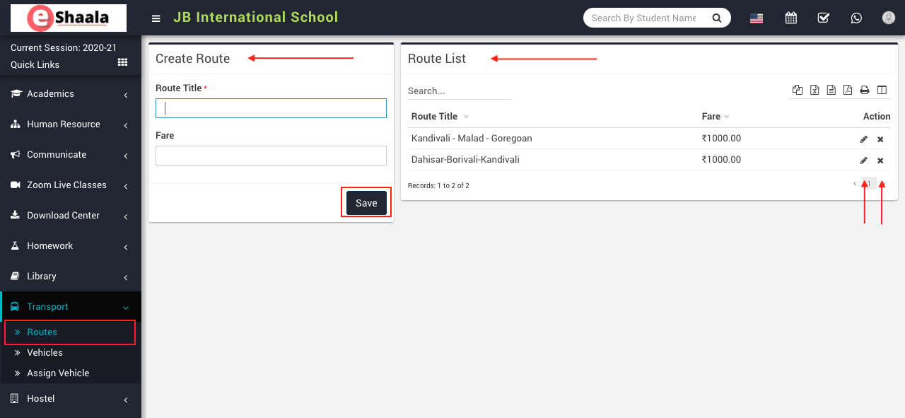 To create routes, go to Transport > Routes here enter Route Title and Fare, then click on the Save button. You can view this added route in the Route List on the right side of the page.