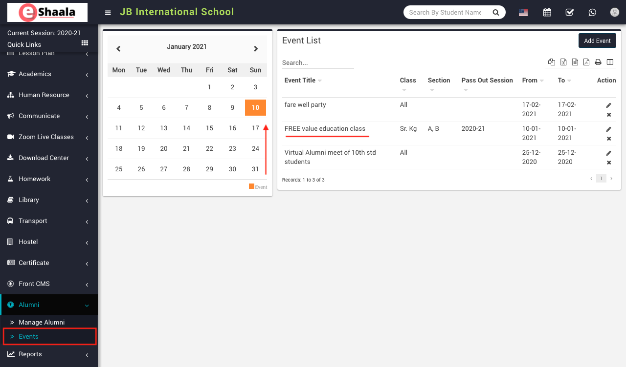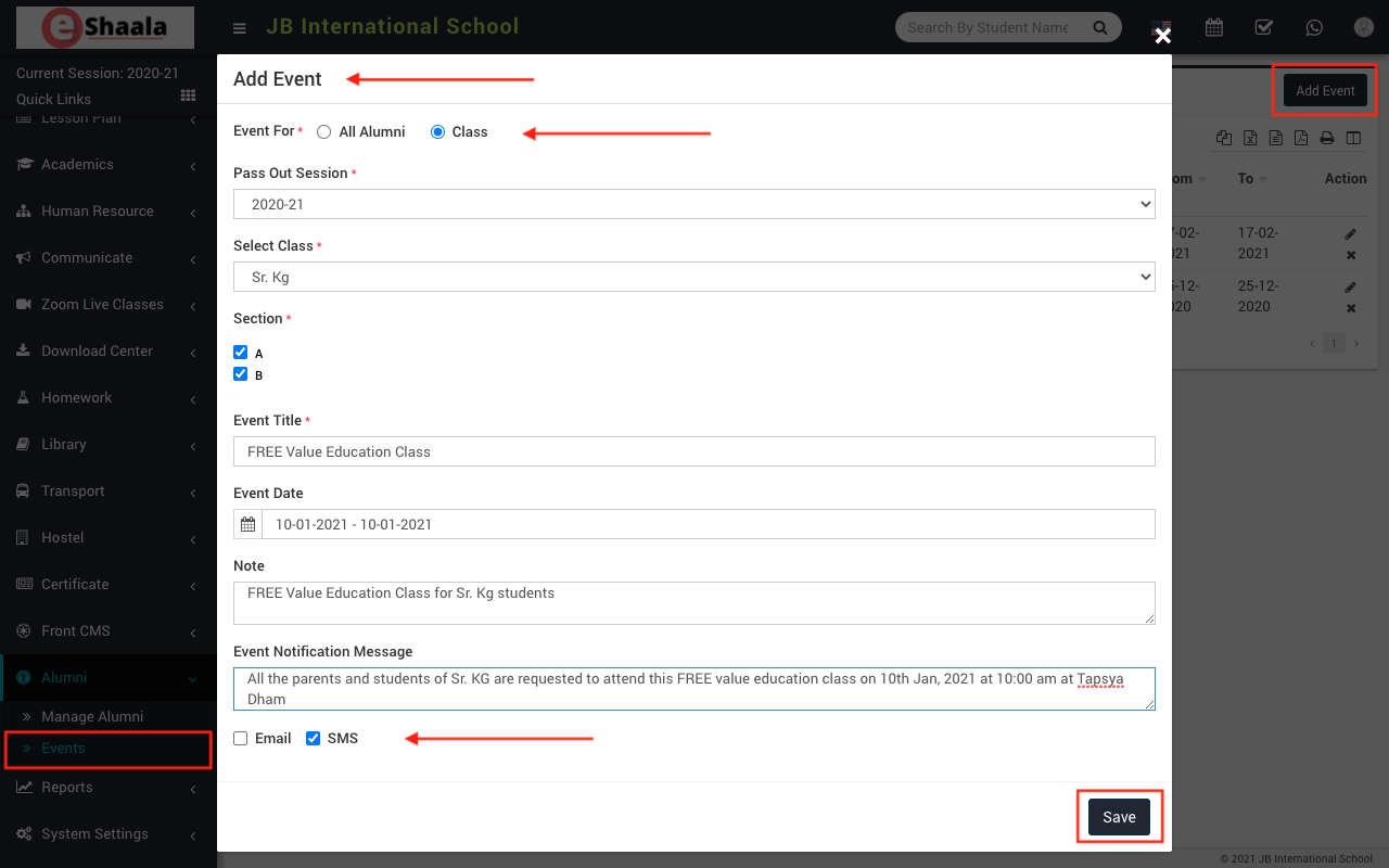 Here select event for All Alumni or select for Class – Section then enter Event Title, Event Date (Start-End), Note, if you want to send a notification to Alumni then also enter Event Notification Message then check on SMS option and click on Save button.