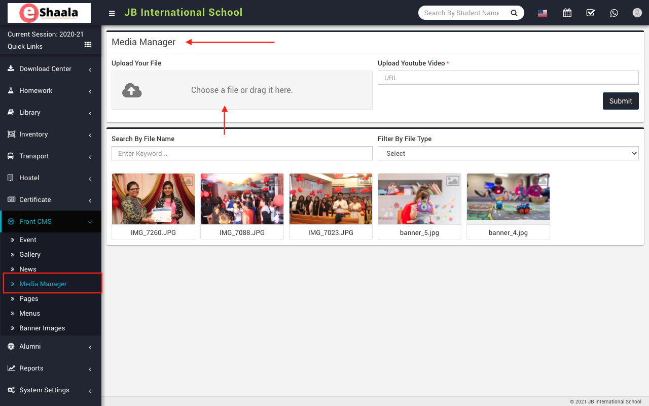 To upload a file, go to Front CMS > Media Manager then Choose or drag the file in the Upload Your File option then enter Upload Youtube Video URL and then click on Submit button. You can search media by entering any keyword in Search By File Name textbox and you can also search any file by selecting file type ( like video, text, zip, rar etc.).