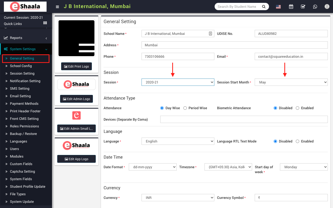 To change your session, go to the General Settings > System Settings menu, then go to the General Settings page, then select the session and month in which your new session will start, and select the Save button below to switch from your session to the current session.
