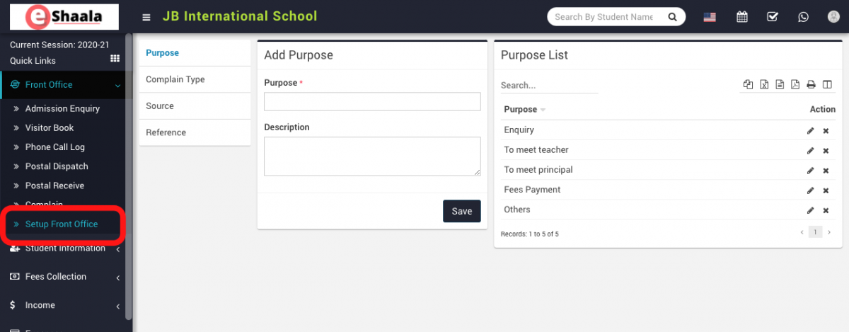 Here, enter Purpose and Description and then click on the Save button. You can view the added records in the Purpose List on the right side of the page.