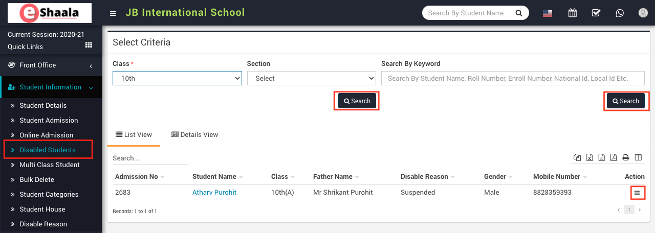 To view disable student, go to Student Information > Disabled Student then select Class and Section and then click on the Search button. You can also search the student by keyword in Search Text Box and then click on the Search button. The list of all disabled students will be shown at the below of the page.